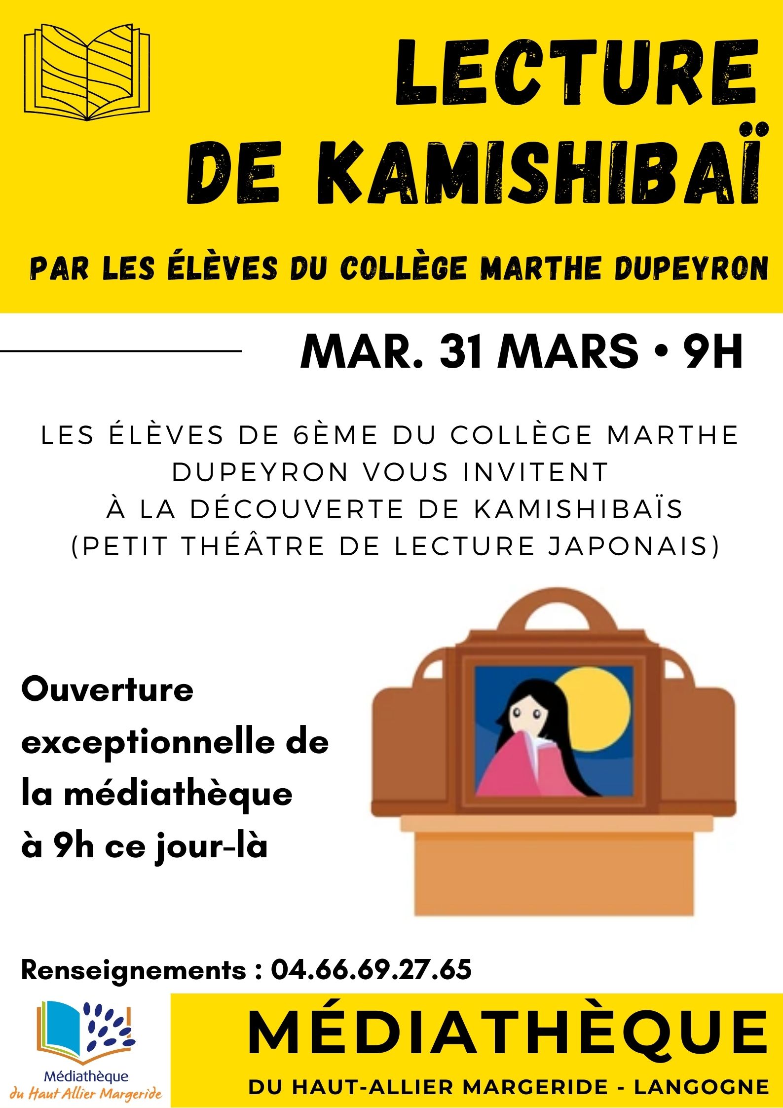 Le kamishibai est une tradition de lecture japonaise qui allie l'image et le texte, comme un petit théâtre ou un petit écran manuel ; les élèves de 6° vous invitent à la lecture publique qu'ils feront à l'auditorium de la médiathèque, le mardi 31 mars à 9h00. Venez découvrir cet art de la lecture !